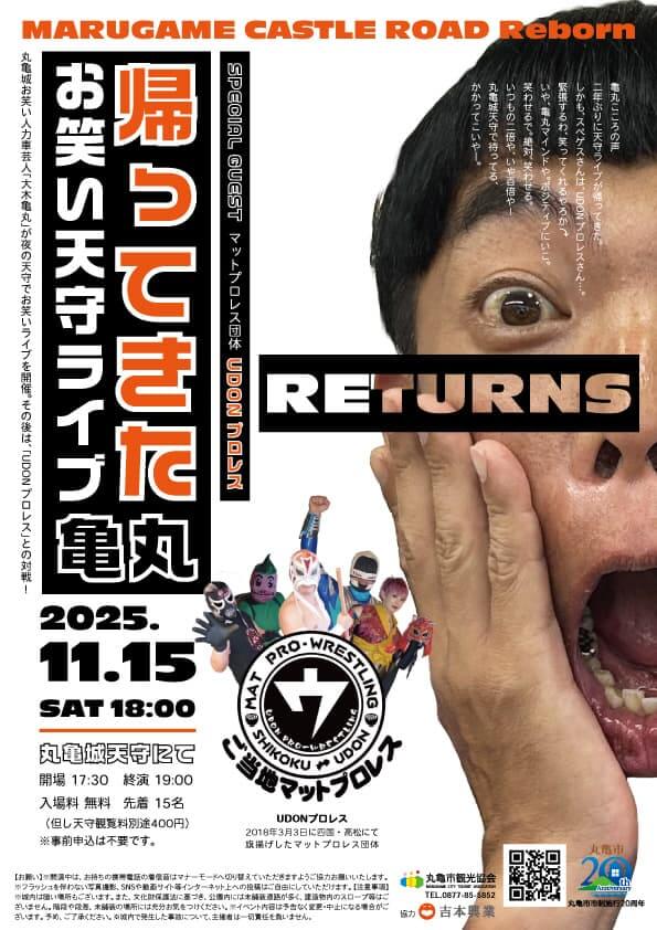 2025年11月15日(土)18:00~19:00の1時間、丸亀城お笑い人力車芸人「大木亀丸」が丸亀城天守でお笑いライブを行います。