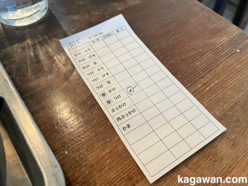 店員が注文を聞きに来るので、食べたいうどんや天ぷらを伝えましょう。