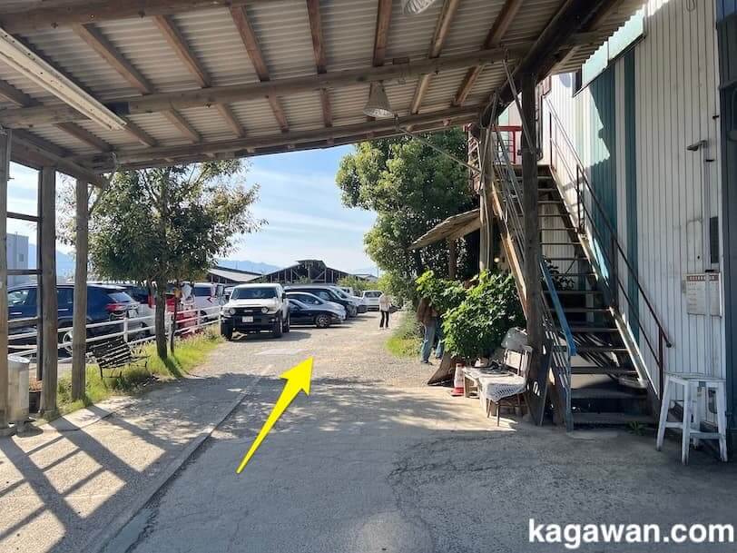 敷地に入った後は、店の入口の前の道を通り抜けてください。
