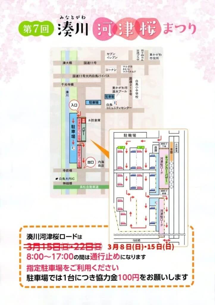 湊川河津桜まつりに参加する人は、湊川河津桜ロードの南側から行かず、北側にある駐車場出入口から駐車場に入るようにしてください。