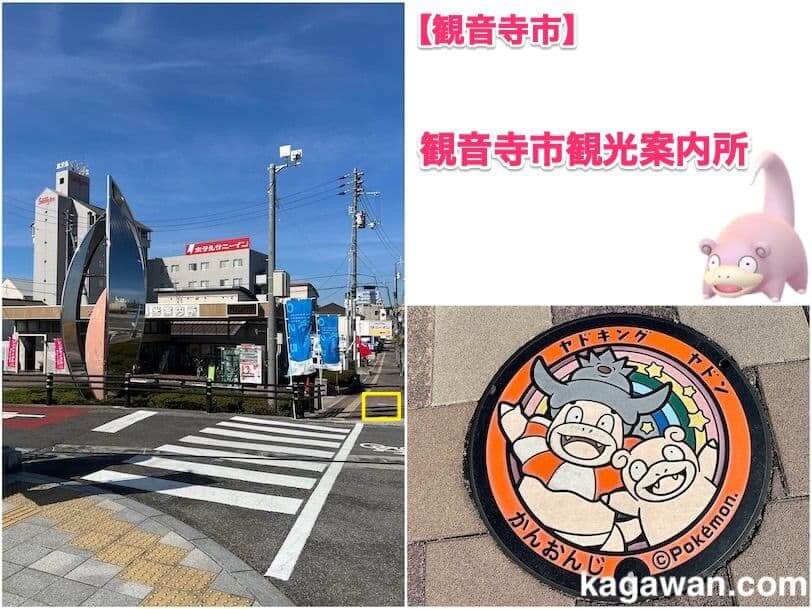 観音寺市にあるヤドンマンホールの場所は、観音寺市観光案内所前の歩道にあります。