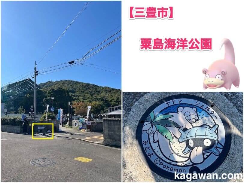 三豊市の粟島にあるヤドンのマンホールは、粟島海洋公園の北東側にあります。