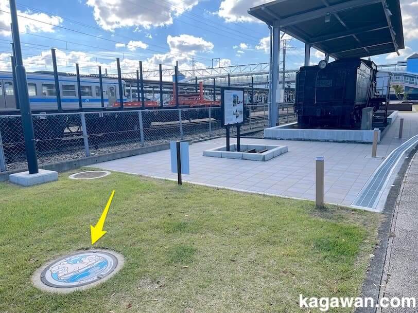 坂出市のヤドンのマンホールは、JR坂出駅にあります。
